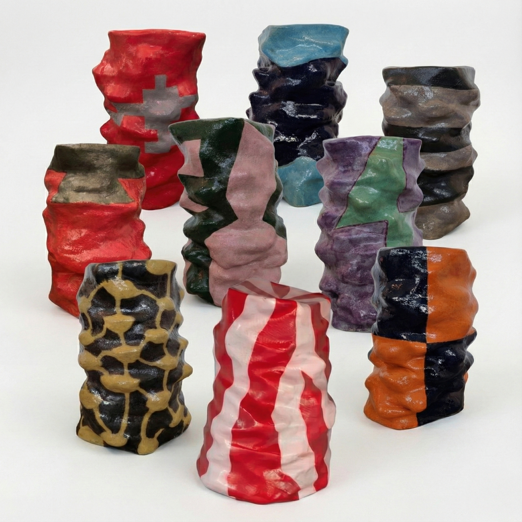 A series of nine unique stoneware tabourets, each a layered outburst of colour and form.